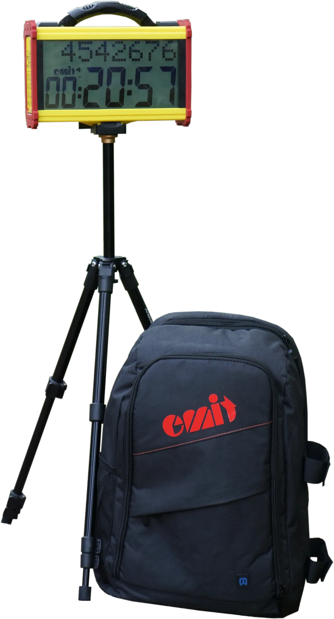 This start clock made by Emit (a SPORTident subsidiary) is innovative through its large LCD display, which means low power and readability in brightest conditions and also at night through backlighting. Its (non-removable) rechargeable battery means the clock can work for up to 36 hours. It comes with a tripod and a carrying case. It has been designed to work in a wide range of temperatures, down to -30 degrees.